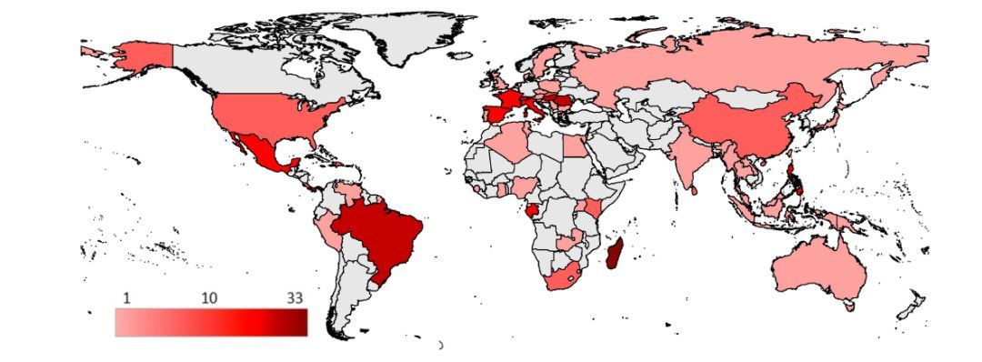圖4. 不同種屬蝙蝠的分佈範圍,顏色越深表示分佈越多(Bat Flies and Their Microparasites: Current Knowledge and Distribution)[6****]
