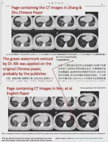 伊麗莎白注意到,王文展示的該病人的CT影像的最後一圖,也就是展示病人CT影像有所好轉的那一幅,上面有不明的綠色水印。後來,伊麗莎白髮現該圖實際上直接出自前面提到的張朱文,那個綠色水印是中國知網的水印。顯然王文截圖時也沒管這些小節。(據伊補充,有人問了被截圖的原作者,原作表示根本不知道自己圖被人截走了發表。)