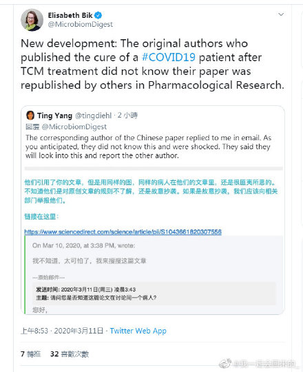 不過,有趣的是,該文章的部分圖片來源於來源於天津中醫藥雜誌發表的題為“中西醫結合治療新型冠狀病毒肺炎高度疑似病例1例及核酸檢測分析”,同時該文章沒有在文章中透露圖片的具體來源。另外,該文章所提出的數據,缺乏對照,引起了很多的憂慮。