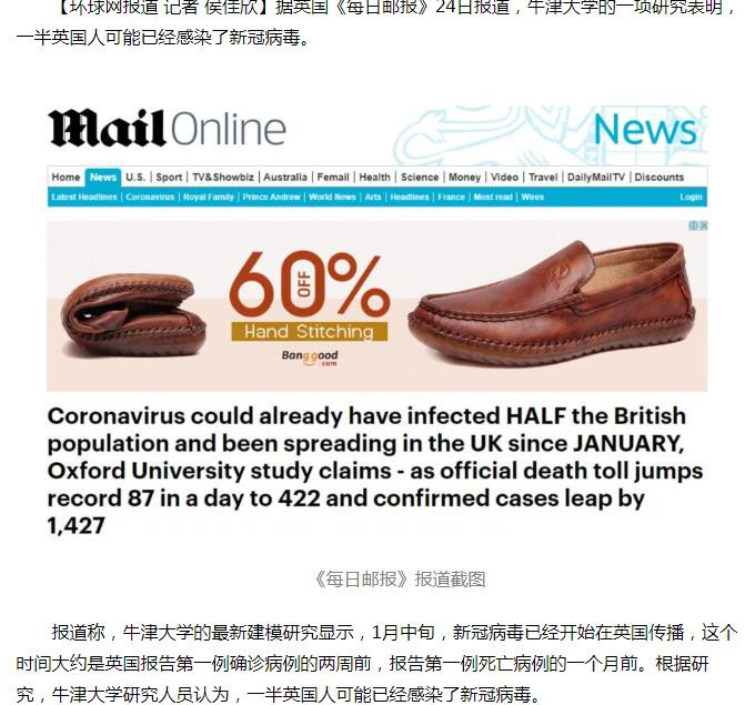 3月26日牛津大學之披露報道《牛津大學研究:病毒自1月份就開始在英國擴散,可能一半英國人已經感染》,如下圖: