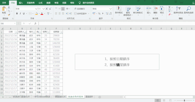 操作步驟:選中數據表的任意一個單元格,在【數據】選項卡下點擊【排序】,主要關鍵字選擇“日期”(升序排列)。點擊【添加條件】,次要關鍵字選擇“銷量”(升序排列),點擊【確定】,完成。