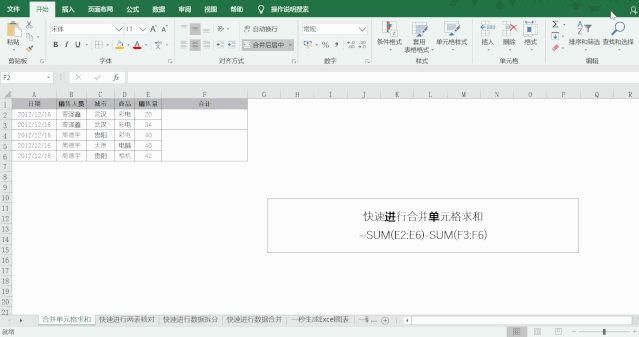 這裏要注意的是因為**合併單元格的總值都存儲在左上角的第一個單元格中,**所以要減去除了f2以外的所有單元格。