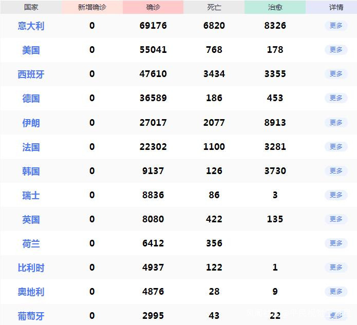 意大利:確診69176例,死亡6820,死亡率達9.85%,超高,已經有選擇性救治的操作(即放棄挽救老弱病),因此風險係數目前是最高的,但是由於它是歐洲國家中最早採取封城封國的措施,且有中國、俄羅斯等國家的支援,因此,目前看有遏制可能的跡象,但由於歐洲人的自由習慣,以及該國醫療資源已經達到臨界極限,因此,疫情反覆可能性還是比較大了,控制得好確診病例可能在20萬以內,控制得不好,隨着醫療資源的透支及隨之可能的生活物質透支,將會出現放棄局面,因此還是能有機會離開就離開的好。
