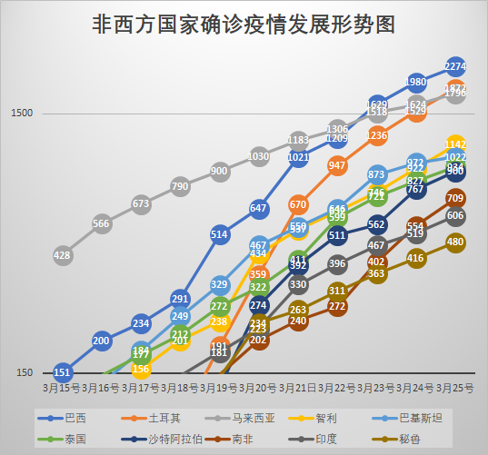 巴西和土耳其就一直處於爆發狀態,大體三天翻一番。再過一週,就是七八千的等級了。希望它們發展慢一點,等歐洲國家消停一些以後,世界才可能騰出手來幫助它們呀。