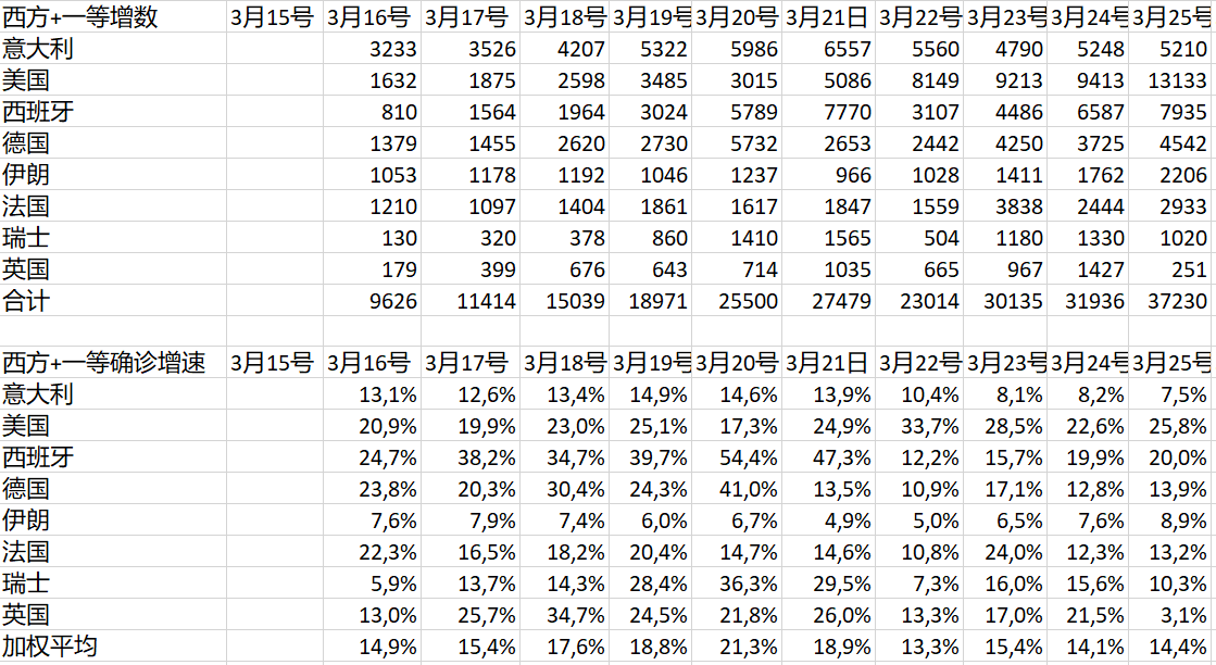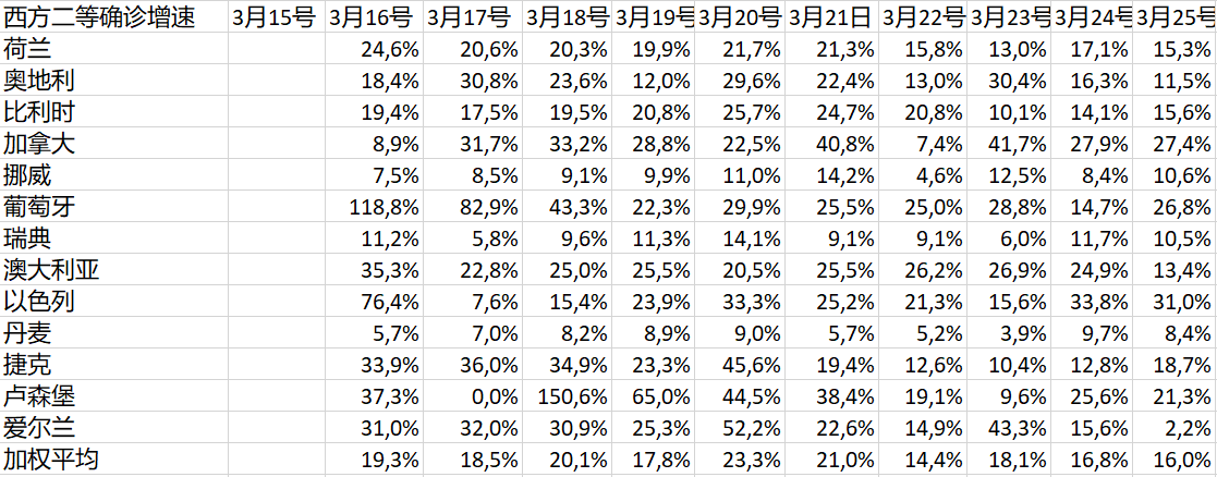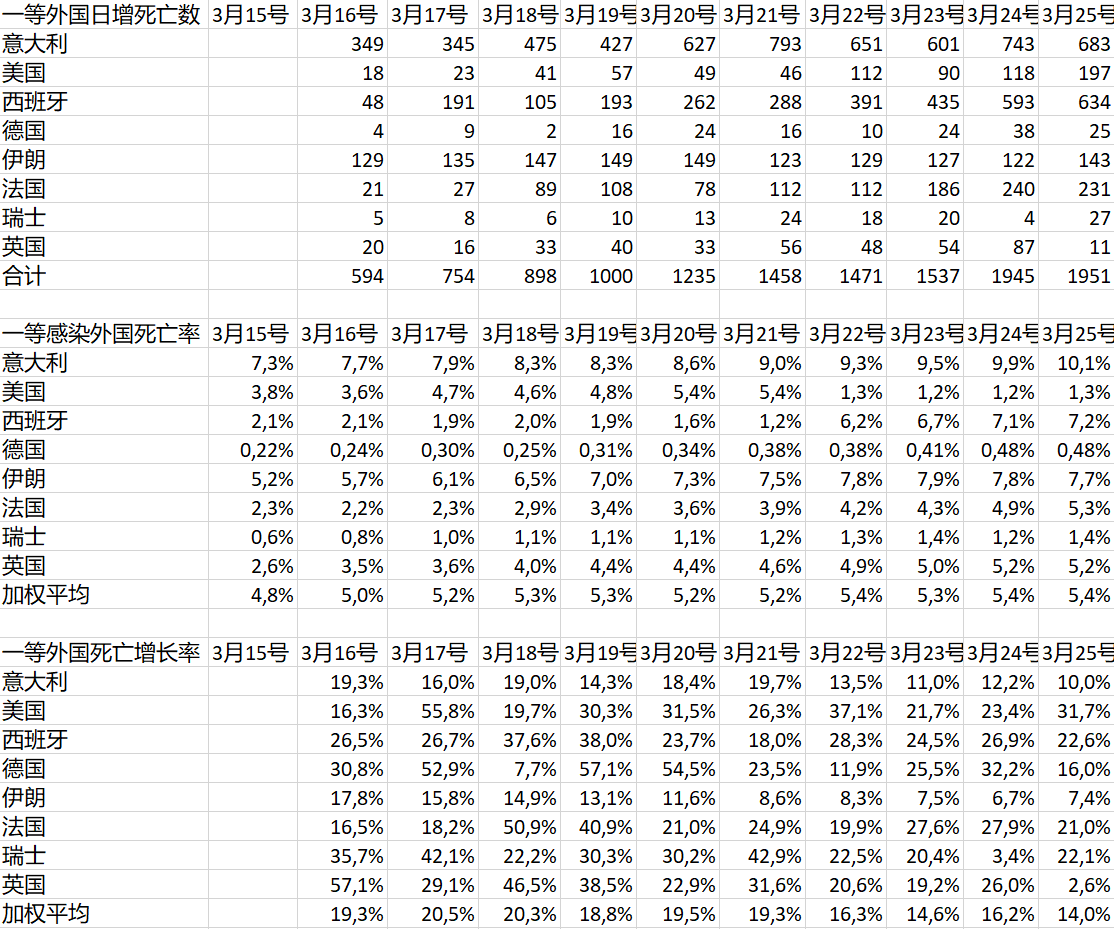昨天新增的那張現存確診的表,今天就是省了。反正除了中國和韓國,所有的國家都還在上升期,還沒有真正輪到哪個國家很快就要開始下行。晚一些有這種跡象了,再重新開始關注這第二個峯值拐點的出現吧。現在還是先把第一個峯值拐點搞定再説。