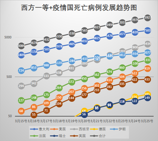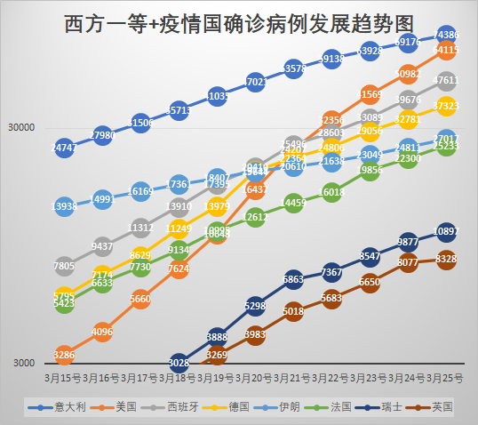 最感憂心的是,**現在的美國確診人數在已經很大的基數上繼續瘋狂增長。三天翻一番呀!日增1.3萬呀!**照此速度,明天美國就很可能超過意大利取得西方第一,後天就可以超過中國的歷史記錄,達到10萬左右的驚人紀錄而躍居世界新冠疫情的無國可能超越的首位!可是,特朗普還説,他打算在4月15號解除美國的各項封鎖,讓經濟逐步恢復正常!他的確是一個特離譜的總統。屆時,美國的罹病人數應當已經遠超20萬,死人也會遠超2萬。輿情必定洶洶可怖。他怎麼可能開封?唉!美國人民不幸啊!