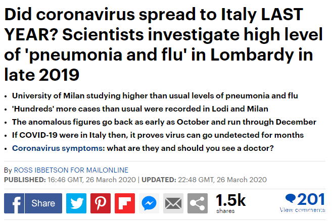 米蘭的馬里奧·內格里(Mario Negri)藥理研究所所長朱塞佩·雷穆齊(Giuseppe Remuzzi)説,倫巴第大區一些家庭醫生去年年底報告了異常肺炎病例,現在看來有些可疑。