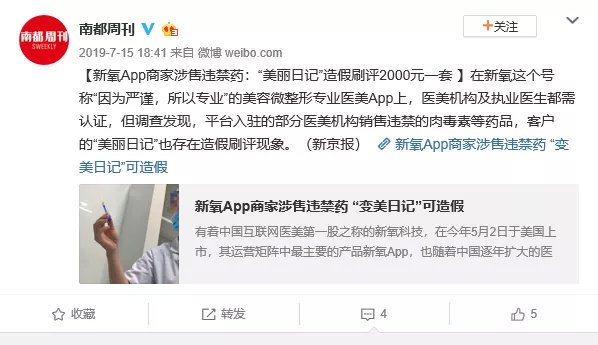 2019年7月,新氧平台“美麗日記”造假,引發媒體關注