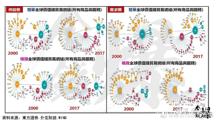 從2000年以來到2017年,無論是供給側(左邊),還是消費側(右邊),無論從簡單協作還是複雜協作方面看,中國都是最大贏家,2000年的時候世界三大製造中心和價值中心是美國、歐盟(德國為核心)和日本,兩大消費中心是美國、歐盟(德國為核心),也就是説2000年的世界經濟協作和聯動是美國一張大網、歐盟一張大網、日本一張小網。