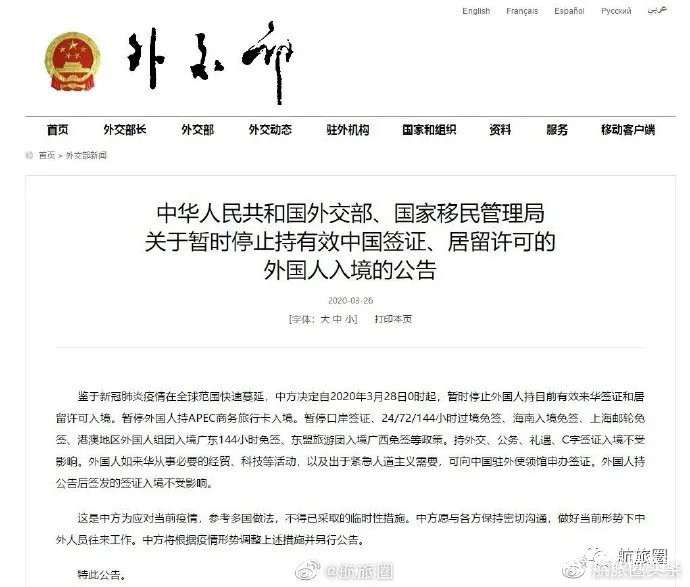 外交部、國家移民管理局發佈公告,自2020年3月28日0時起暫停持有效中國簽證、居留許可的外國人入境。同時將暫停外國人持APEC商務旅行卡入境。暫停口岸簽證、24/72/144小時過境免籤、海南入境免籤、上海郵輪免籤、港澳地區外國人組團入境廣東144小時免籤、東盟旅遊團入境廣西免籤等政策。**持外交、公務、禮遇、C字簽證入境不受影響。**外國人如來華從事必要的經貿、科技等活動,以及出於緊急人道主義需要,可向中國駐外使領館申辦簽證。外國人持公告後簽發的簽證入境不受影響。