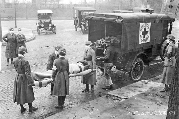 資料圖片:1918年美國紅十字會成員在密蘇里州聖路易斯市搬運感染流感的受害者。(《華爾街日報》網站) 因是中立國故最先公開