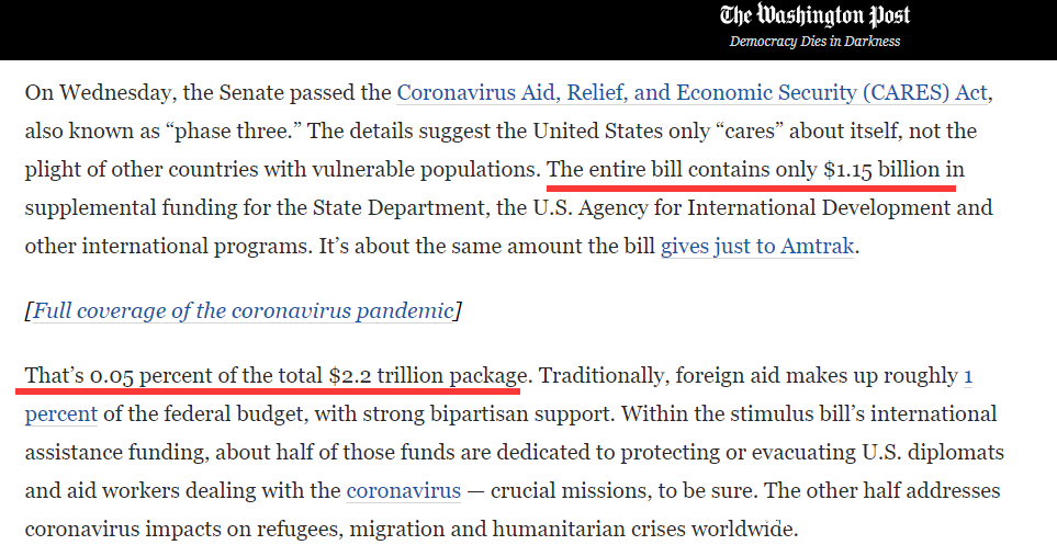這名記者的不滿在於:儘管美國國會即將通過美國曆史上最大額的2萬億救市計劃,以求保住疫情衝擊下的美國經濟,可這筆錢中撥給美國國務院、美國國際開發署等國際項目的錢卻只有11.5億美元,僅佔整個2萬億的0.05%,遠少於以往外援資金在聯邦政府預算中佔比1%的比例。