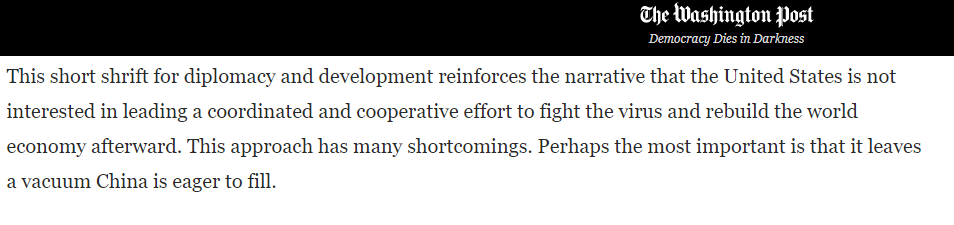 因此,儘管美國國務院宣佈將對外援助2.74億美元用於抗擊疫情,這名美國強硬的反華鷹派記者仍然焦心地指出,這點錢顯示出美國“沒有興趣”在抗擊疫情和之後重建世界經濟的工作中發揮領導的作用,並認為這種做法最大的一個短版是“會讓中國填補上這一真空”。