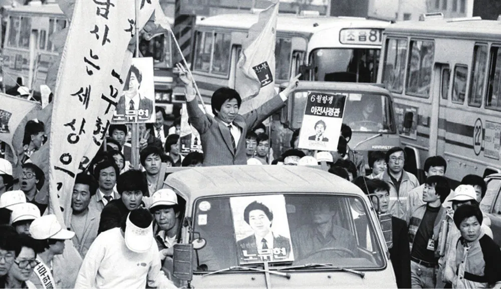 盧武鉉一波又一波的遊行攻勢,讓軍政府越來越吃不消,手上沾滿血腥的軍人大統領全斗煥“看破紅塵”,起了歸隱山林古廟的念頭,其繼任者軍頭盧泰愚搖身一變,成為“民主人士”,趁機拋出“六二九宣言”,許諾下屆總統開始直選。
