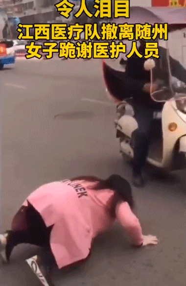湖北隨州街頭,一個女子也是五體投地,不斷作揖。