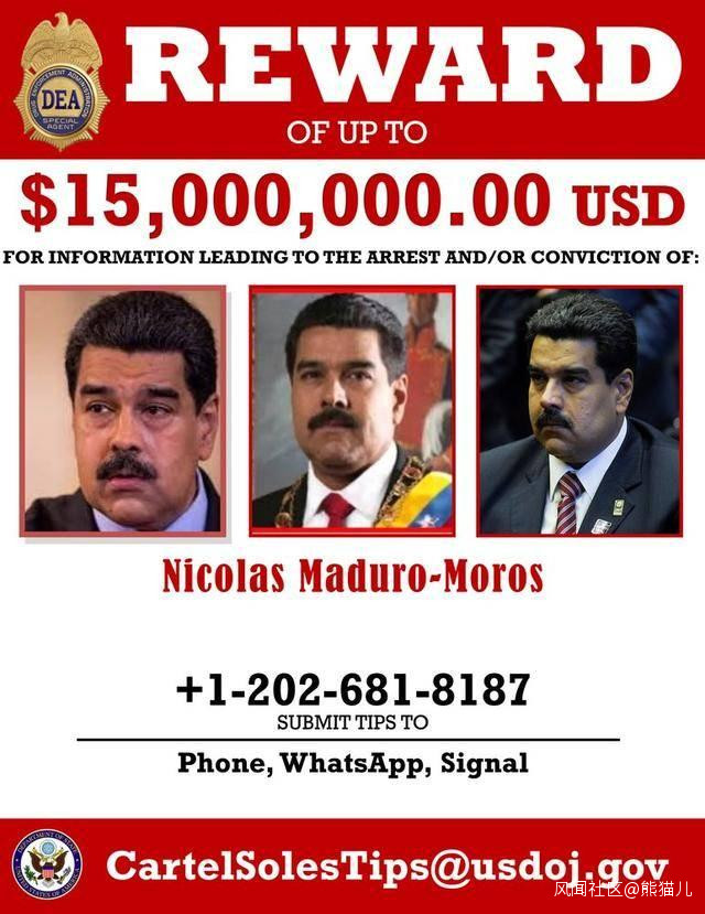 目前,美國司法部正式向馬杜羅發出了通緝令,並對馬杜羅本人發出高達1500萬美元的鉅額懸賞金,對其餘人等則懸賞以1000萬美元,以獎勵那些對抓捕馬杜羅提供有用信息者。