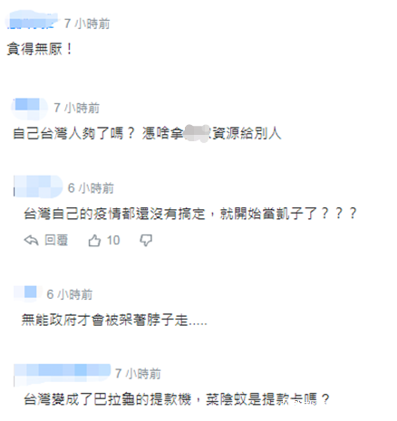 對此,島內有網民稱巴拉圭“貪得無厭”,有網民則諷刺民進黨當局,自己的疫情都沒搞定,就開始當“凱子”,無能當局才會被駕着脖子走。↓