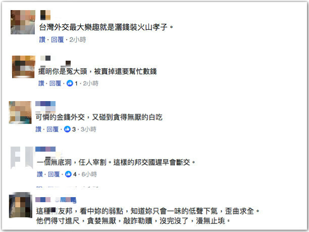 “這種‘友邦’看中你的弱點,知道你只會一味的低聲下氣,歪曲求全。”對於民進黨當局和巴拉圭這種患難見“真情”的赤裸裸利益關係,島內網友深惡痛絕:“他們得寸進尺,貪婪無厭,敲詐勒贖,沒完沒了,漫無止境。”“可憐的金錢‘外交’,擺明你是冤大頭,被賣掉還要幫忙數錢。”“台灣‘外交’最大樂趣就是灑錢裝火山孝子。”“一個無底洞,任人宰割,這樣的‘邦交’遲早會斷交。”