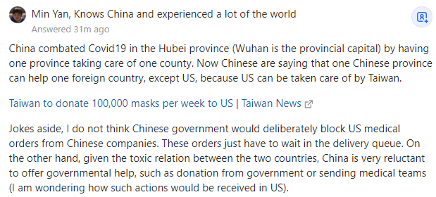 中國在湖北省(武漢是湖北省會)通過一個省照顧一個縣市來對抗Covid19。現在中國人説一箇中國省份可以幫助一個外國,除了美國,因為台灣省可以照顧美國。