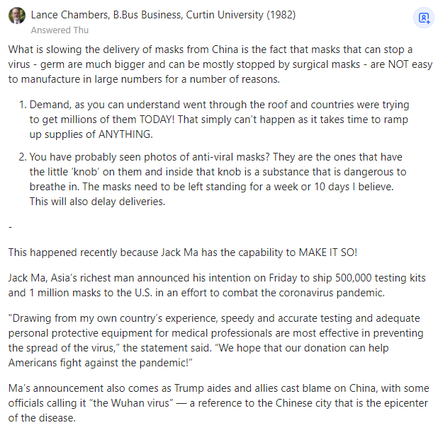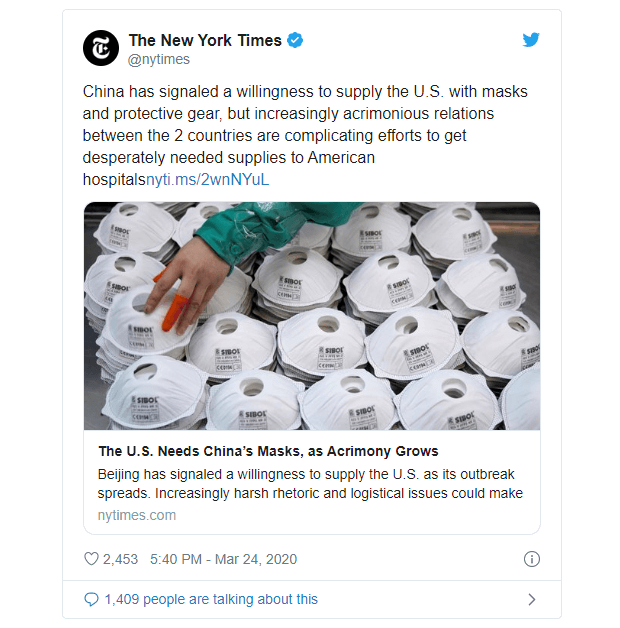 開玩笑的是,我不認為中國政府會故意阻止美國向中國公司下達醫療用品訂單。這些訂單隻能在交貨隊列中等待。另一方面,鑑於兩國之間的有毒關係,中國非常不願意提供政府幫助,例如政府捐贈或派遣醫療隊(我想知道美國將如何接受這種行動)。