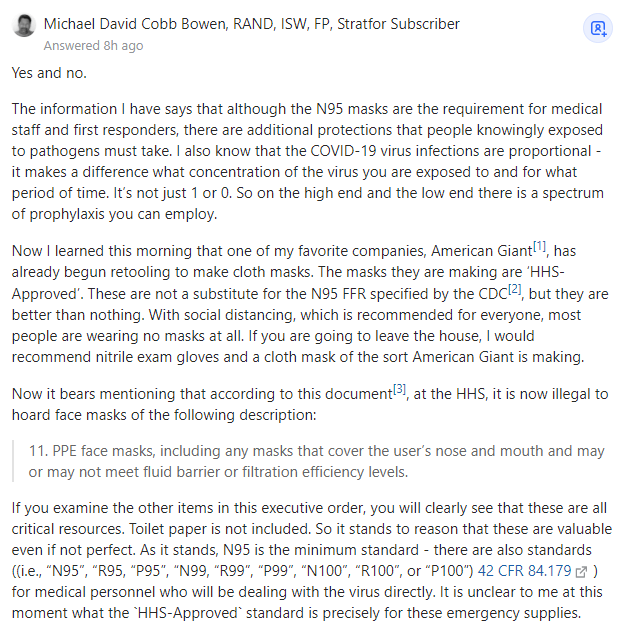 據我所知,儘管N95口罩是醫務人員和急救人員的必備品,但人們在知情的情況下必須採取額外的防護措施。我也知道COVID-19病毒的感染是成比例的,它取決於你接觸的病毒濃度和時間。這並不是0或者1的問題。所以在高要求和低要求之間,你可以使用一系列的預防措施。