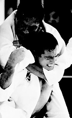 霍華德右手握拳橫着向安道掄了過來,安道右臂架住黑人右肩後側,左臂象繩子一般繞過黑人脖子,右臂上揚,左手抓住右上臂,右臂回折用掌緣壓住黑人後腦,一個不能再標準的裸絞完成!