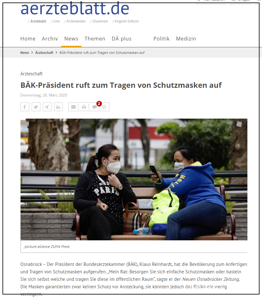 1據《德國醫生報》26日報道,德國醫學委員會主席克勞斯·萊因哈特呼籲國民製作並佩戴防護口罩。