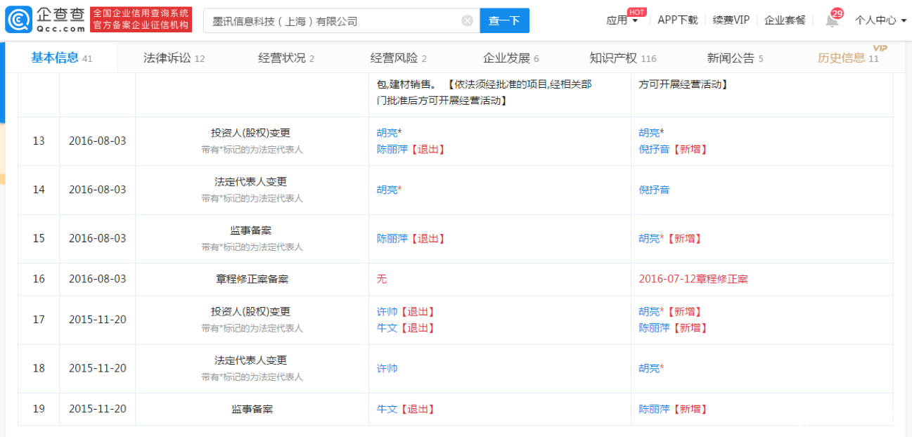 表面看似與快牛金科並無關聯,實則密不可分。2016年8月3日,墨訊信息科技(上海)有限公司(以下簡稱“墨訊科技”)的股東由胡亮、陳麗萍變更為胡亮、倪抒音,而墨訊科技為快牛金科運營主體上海淡紅金融科技有限公司全資子公司。