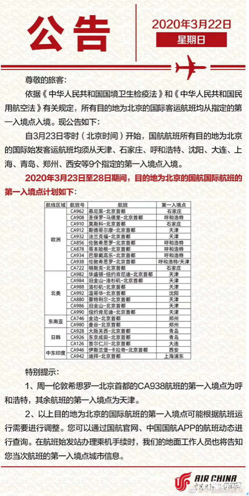 3月22日,五部委發佈第二號公告,要求所有飛航北京的國際航班都經由第一入境點入境,包括所有國外航空公司。雖然疫情初期不少國外航司都已經停飛了北京航班,但是仍有少數外航在飛往北京。11家外航中,日本,韓國,阿聯酋各佔兩家,埃塞俄比亞,俄羅斯,新馬泰各有一家,這些航空公司總共仍為北京提供了每週約50班國際航班。
