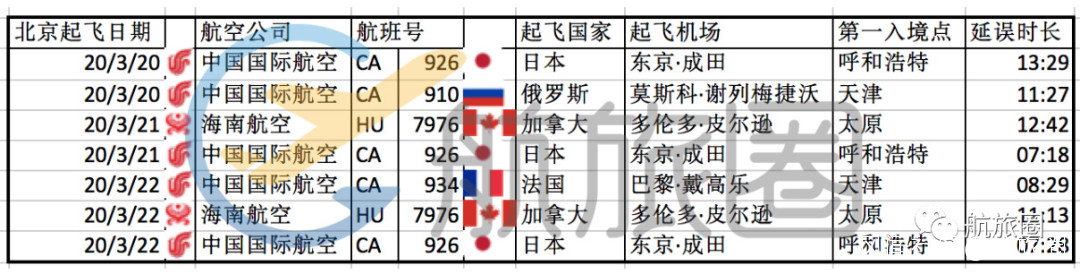 國航的三班來自東京的航班的第一入境點都是呼和浩特。3月20日的CA926是第一班吃螃蟹的航班。從20日18:50到21日7:41,這架國航的A330在呼和浩特停留了12小時34分鐘,終於在延誤13個半小時後到達北京。