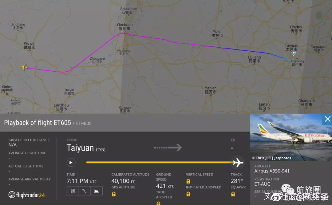 埃塞俄比亞航空保持着每天一班A350從亞的斯亞貝巴飛往北京,3月23日埃塞俄比亞航空經由太原前往北京的ET604在了晚點9小時12分鐘順利抵達北京機場。然而3月24日的ET604卻在24日下午14:53到達太原,停了一天一夜後,於26日凌晨1:49起飛直接返回亞的斯亞貝巴。看上去,這架飛機好像並沒有飛到北京。目前,埃塞俄比亞航空並未就疑似從太原直接折返的情況發佈任何公告。