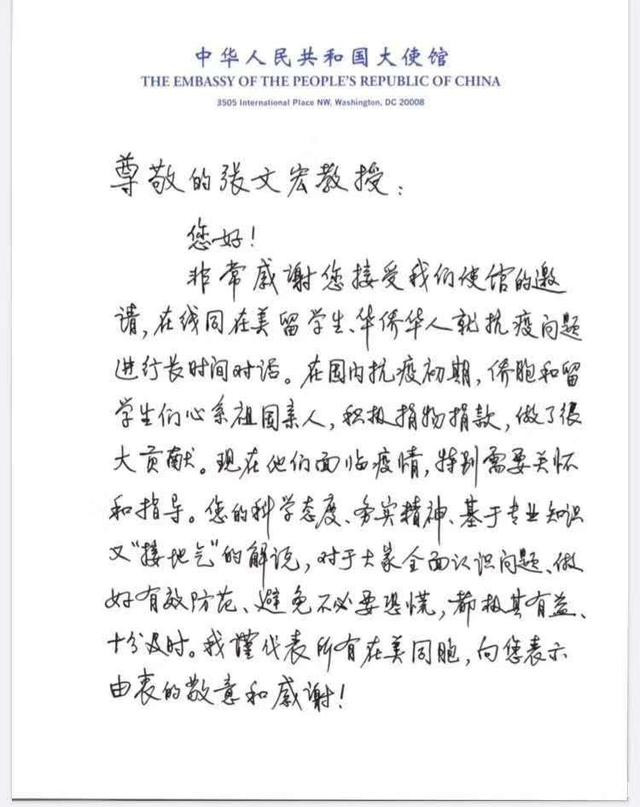 非常感謝您接受我們使館的邀請,在線同在美留學生、華僑華人就抗疫問題進行長時間對話。在國內抗疫初期,僑胞和留學生們心繫祖國親人,積極捐物捐款,做了很大貢獻。現在他們面臨疫情,特別需要關懷和指導。您的科學態度、務實精神、基於專業知識又“接地氣”的解説,對於大家全面認識問題、做好有效防範、避免不必要恐慌,都極其有益、十分及時。我謹代表所有在美同胞,向您表示由衷的敬意和感謝!