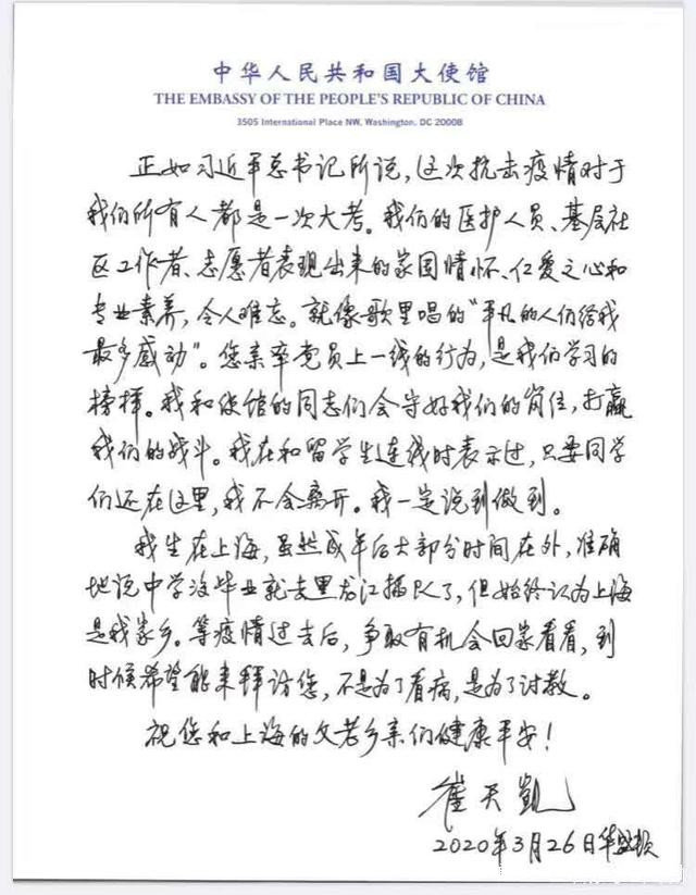 崔天凱在信中提到,張文宏親率黨員上一線的行為,是我們學習的榜樣。崔天凱表示,自己和使館的同志們會守好崗位,打贏戰鬥。 “只要同學們還在這裏,我不會離開。我一定説到做到。”