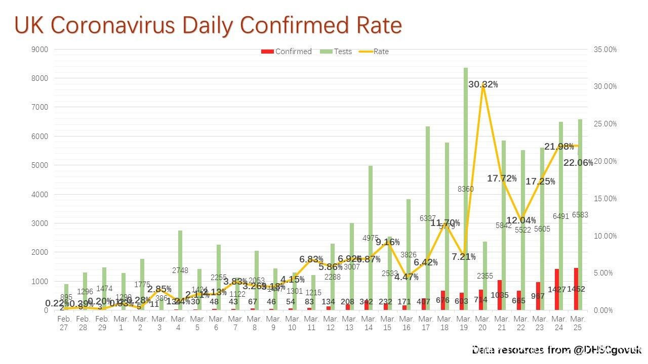 當地時間25日,英國衞生和社會保障部公佈最新數據,過去24小時,英國新增新冠肺炎確診患者1452人,累計患者達到9529人。