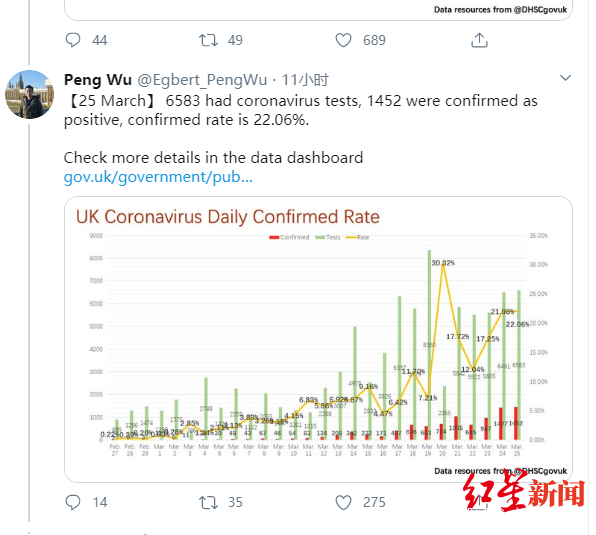 這樣的疫情圖表,他一做就是20多天,每日一更,而且每天都留言發佈在英國衞生與社會保障部疫情通報的推文下面。吳芃告訴紅星新聞記者,從上週開始,他又在圖表中增加了一條顯示死亡病例數的曲線。此外,他還創建了另一個圖表,記錄每天英國進行的病毒檢測數量和檢測結果呈陽性的百分比。