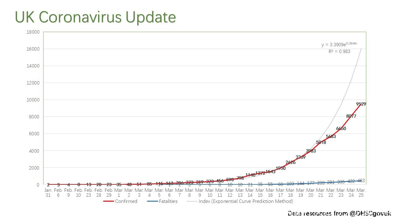 3月25日,吳芃根據英國公佈的官方數據製作的圖表。 吳芃推特 圖 “最開始是一個折線圖,就是英國每天的確診人數,因為政府只是發佈數據,我想通過折線圖讓大家能夠很明瞭地看到昨天發生了什麼、今天發生了什麼,未來會發生什麼,尤其關於未來,我在旁邊用了一個輔助線,採用指數曲線預測法(exponential curve prediction method),再結合前面的數據,擬合出最新的一個指數(見上圖),因為通過之前的報告,病毒傳播往往呈指數式增長。然後實際上就能看到,如果Y的值在變大,就標誌着新冠病毒的傳播速度在增強,其實也能看到,最初Y的值大概是1.8左右,現在已經變成了3.2了。”