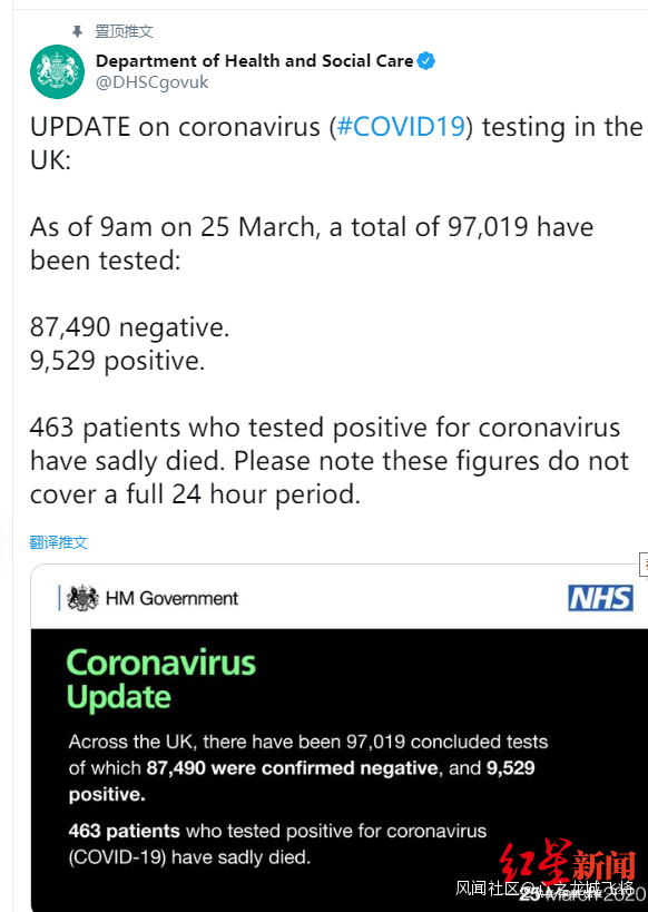 英國衞生與社會保障部在社交媒體賬號上的疫情通報,圖據社交媒體截圖 每日一更,粉絲坐等他更新