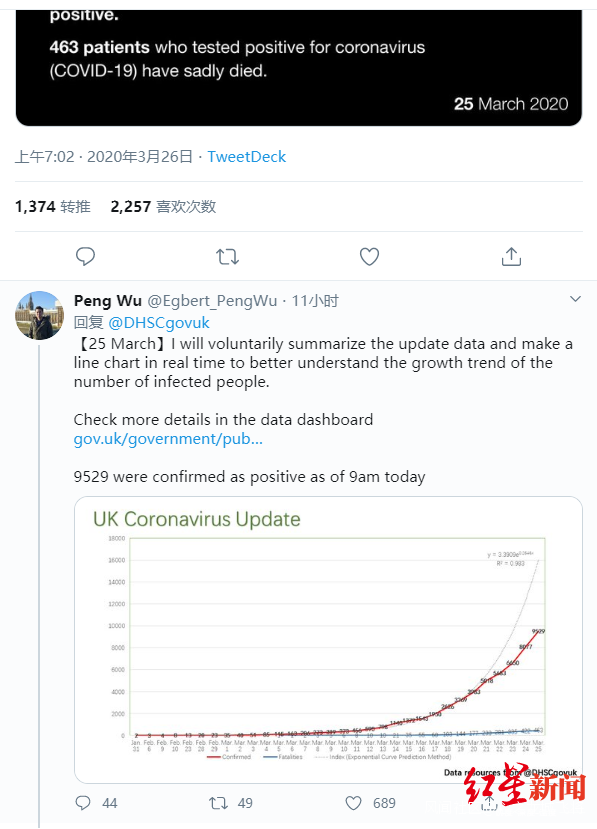 吳芃在英國衞生與社會保障部疫情通報的推文下更新圖表,圖據社交媒體截圖 之所以要做英國的疫情數據增長圖表,還要從3月5日説起。吳芃告訴紅星新聞記者,當時意大利和伊朗的疫情已相當嚴峻,他便十分擔心英國的疫情發展。當天,英國衞生與社會保障部在其官方推特上發佈貼文稱,將努力和儘快為大家提供最新數據。吳芃看到後在其下面留言,“為何英國不能使用大數據技術,實時跟蹤信息?”