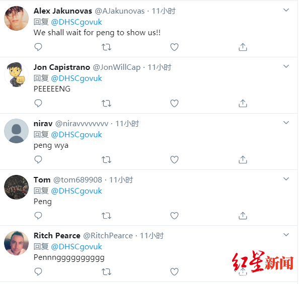 網友排隊喊Peng的名字,社交媒體截圖 當然也有人不明就裏,看着推文下網友們排隊般地喊着Peng的名字,好奇地問,“為什麼每個人都在喊Peng?”甚至,還有英國網友戲稱讓他去做首相。