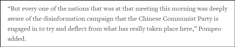 蓬佩奧對媒體稱,中國沒有對外公開疫情相關信息,中國某些官員甚至“説瘋話”,指責美國將病毒帶去了中國。對於中國向各國提供援助一事,蓬佩奧將其污衊為“裝好人”。