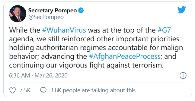 由於疫情暴發,這次G7會議改用視頻進行,本次會議的主要議題之一,是關於合作抗擊疫情。但諷刺的是,在這個討論“團結抗疫”的議題下,美國國務卿邁克·蓬佩奧主動開了“地圖炮”,將新冠病毒稱作“武漢病毒”。