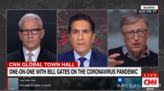 (蓋茨當晚參加CNN《全球市政廳》節目視頻截圖)