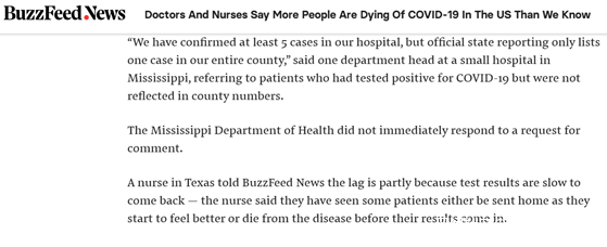 在上圖這篇名為“醫護人員説美國因新冠肺炎而死亡的人數比我們知道的還多”的報道中,Buzzfeed新聞網在開篇第一句就這樣寫道: