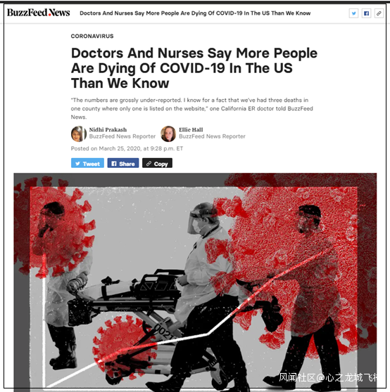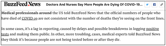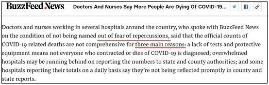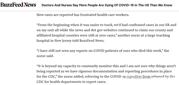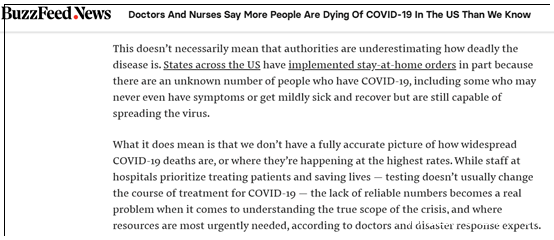 在上圖這篇名為“醫護人員説美國因新冠肺炎而死亡的人數比我們知道的還多”的報道中,Buzzfeed新聞網在開篇第一句就這樣寫道: