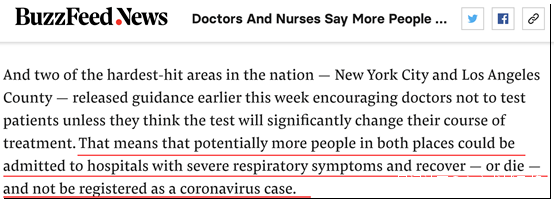 Buzzfeed特別提到了紐約市和洛杉磯縣這兩個疫情嚴重的地方,稱兩地本週早些時候都出台了新的病例檢測要求,要求醫生不要給疑似病例做病毒檢測,除非這種檢測結果能改變病人獲得的治療方案。