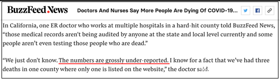 一名在加州多個醫院工作的急診科醫生就對Buzzfeed表示,他認為很多因新冠肺炎病死的人並沒有得到應有的監測,而且一些地方政府也並沒有很好地審計醫院報上來的死亡人數。