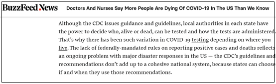 不過,Buzzfeed並不認為這些情況能夠證明美國官方在低估新冠肺炎的致死程度,稱美國許多州政府都已經對民眾下達了不要出門的命令,説明官方清楚社會中還有未知數量的感染者存在,包括那些無症狀的、輕症的、甚至已經開始康復但仍然可以傳播病毒的感染者。