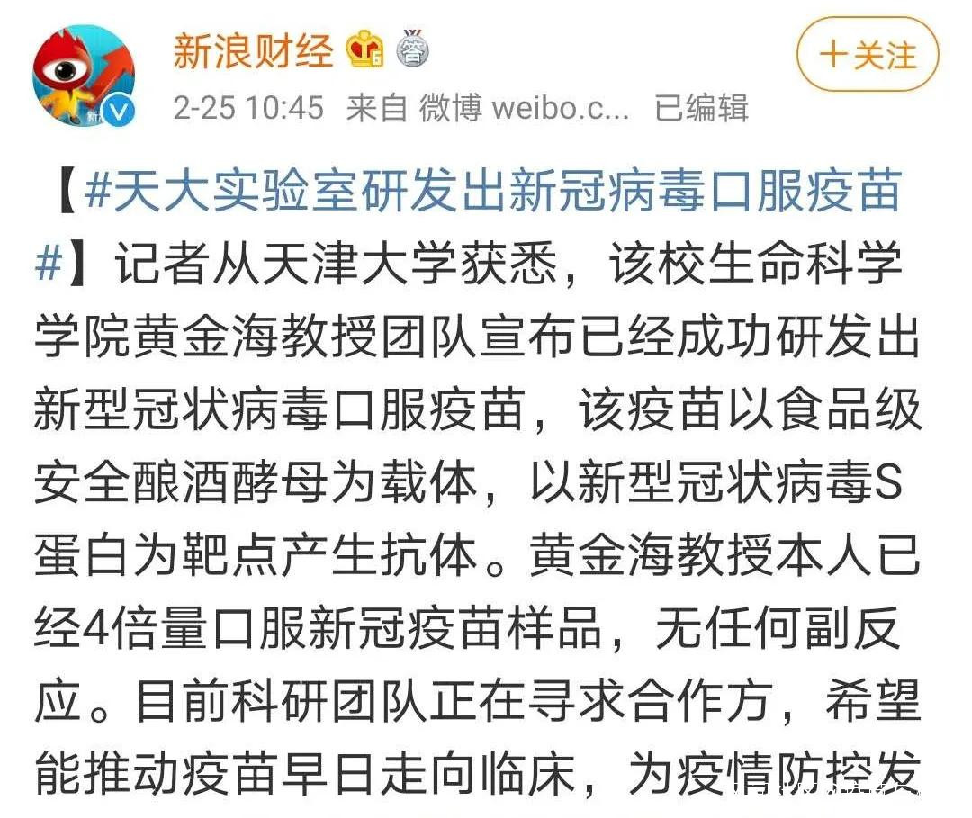 2月25日,天津大學生命科學學院黃金海團隊宣佈:成功以釀酒酵母為載體,2019冠狀病毒S蛋白為靶點,研發出口服疫苗,且黃金海教授本人“以身試藥”,自己4倍量口服樣品,無任何副反應。