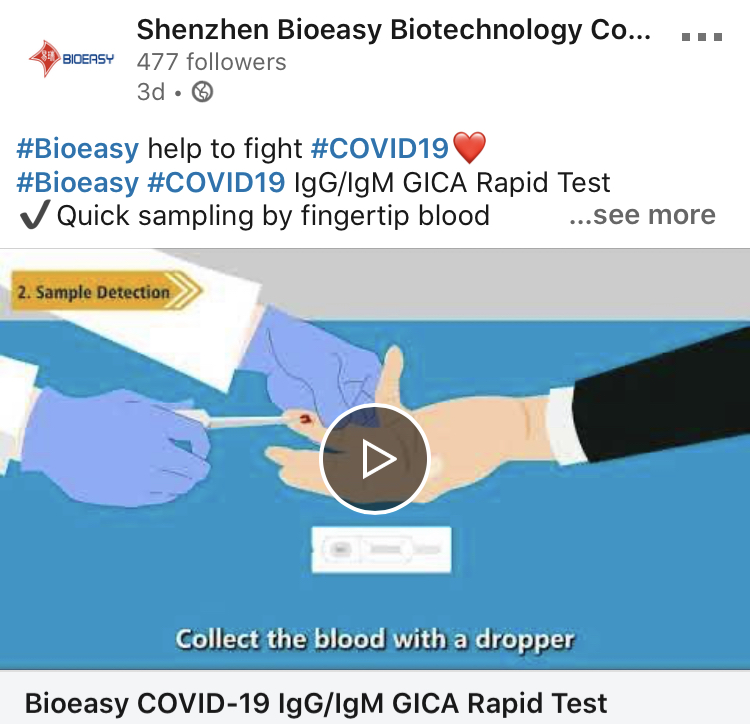 觀察者網27日查詢發現,該企業領英(LinkedIn)賬號@Shenzhen Bioeasy Biotechnology Co., Ltd. 於近日發佈了多條新冠病毒快速檢測試劑盒的廣告,最新一條廣告發佈於3天前。