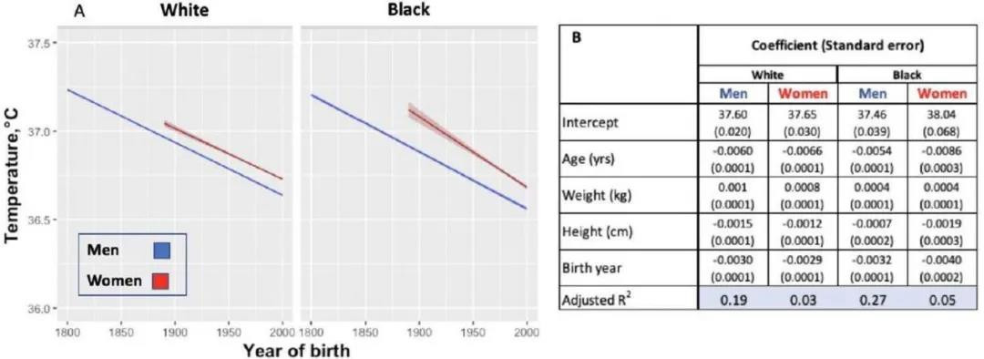 研究的對照分析表明,**19世紀男性的平均體温比現代高0.59°C,每10年大約降低0.03°C;自1890年以來,女性的體温也下降了0.32°C,每10年約0.029°C。**朱莉.帕森內特教授還表示,這不太可能是測量數據的系統誤差,而是實實在在的生理差異。